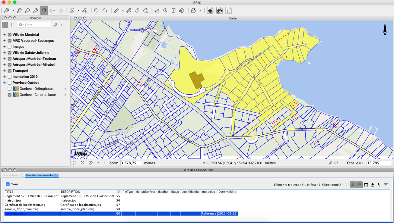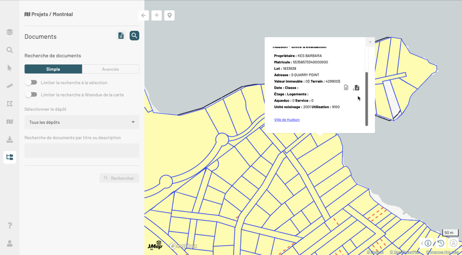 The JMap Documents extension simplifies access to documents associated with map features for users of the JMap Pro, JMap NG, and JMap Survey applications. With just one click, users can view the list of documents linked to a map feature along with their metadata and download relevant documents. This functionality allows, for example, accessing machinery warranties by clicking on the machine, opening an AutoCAD plan by selecting a municipal building, or displaying the list of contracts by clicking on a construction project. These documents can come from SharePoint Document Management System, a local network file system, or hyperlinks.
