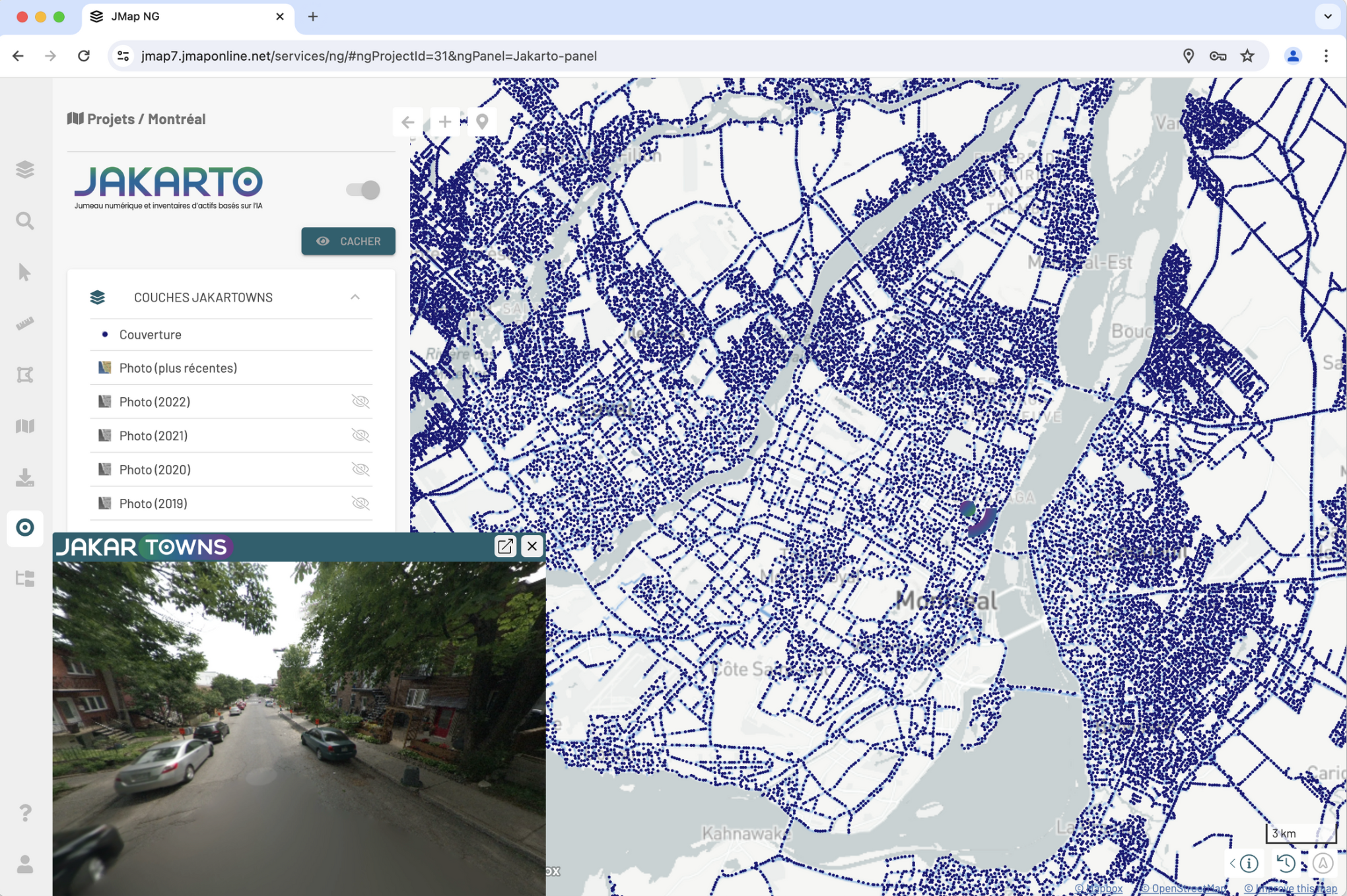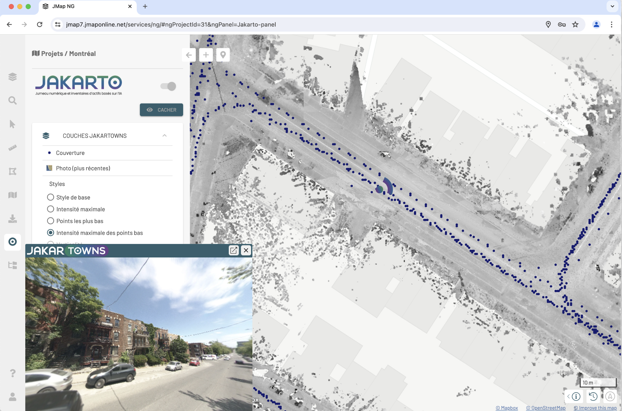 The Jakartowns extension allows for the integration and visualization of data from the Lidar and imagery data collection and valorization platform Jakarto into a JMap NG application. You can view Jakartowns data layers directly on the map and open the Jakartowns viewer with a simple click on the map.