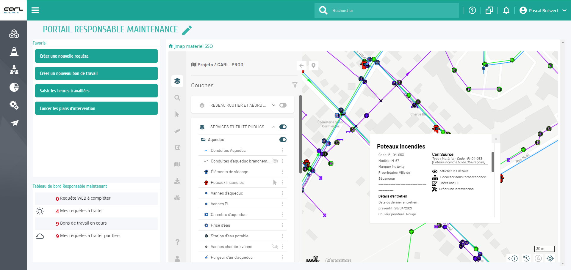 L’extension Carl-Source permet à l’application JMap NG d'être intégrée dans l’interface du GMAO Carl Source permettant ainsi une intégration des données SIG entre les deux systèmes. Les utilisateurs de la plateforme Carl Source peuvent visualiser géographiquement les objets GMAO et les bons de travail dans une carte provenant de JMap NG imbriquée dans l'interface de Carl Source. Différentes interactions sont implémentées entre les deux systèmes à partir de la carte.