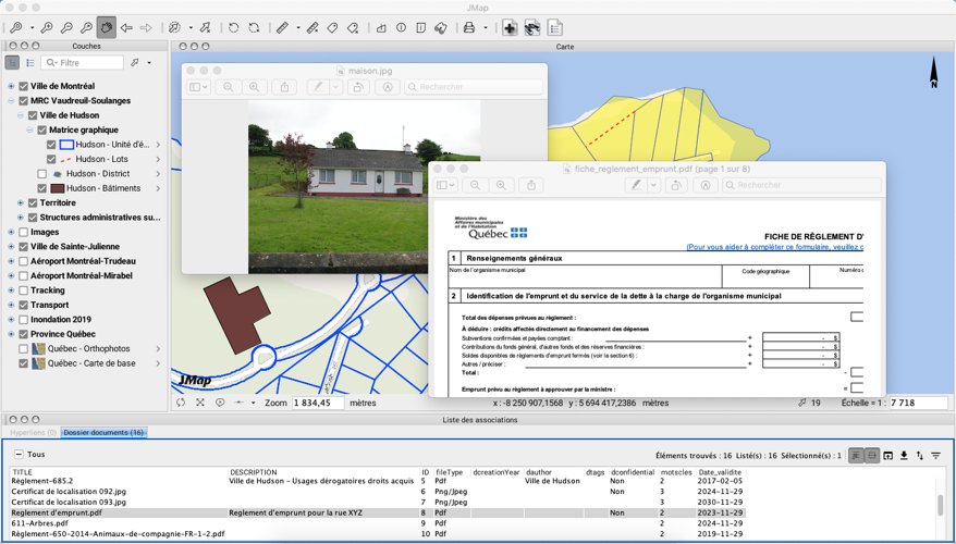 L'extension JMap Documents simplifie l'accès aux documents associés aux éléments de la carte pour les utilisateurs des applications JMap Pro, JMap NG et JMap Survey. En un clic, les utilisateurs peuvent consulter la liste de documents reliés à un élément cartographique ainsi que leurs métadonnées, et télécharger les documents pertinents. Cette fonctionnalité permet, par exemple, d'accéder aux garanties de machines en cliquant sur la machine, d'ouvrir un plan Autocad en sélectionnant un bâtiment municipal, ou encore d'afficher la liste des contrats en cliquant sur un projet de construction. Ces documents peuvent provenir de la GED SharePoint, d'un système de fichiers du réseau local ou de liens hypertextes.